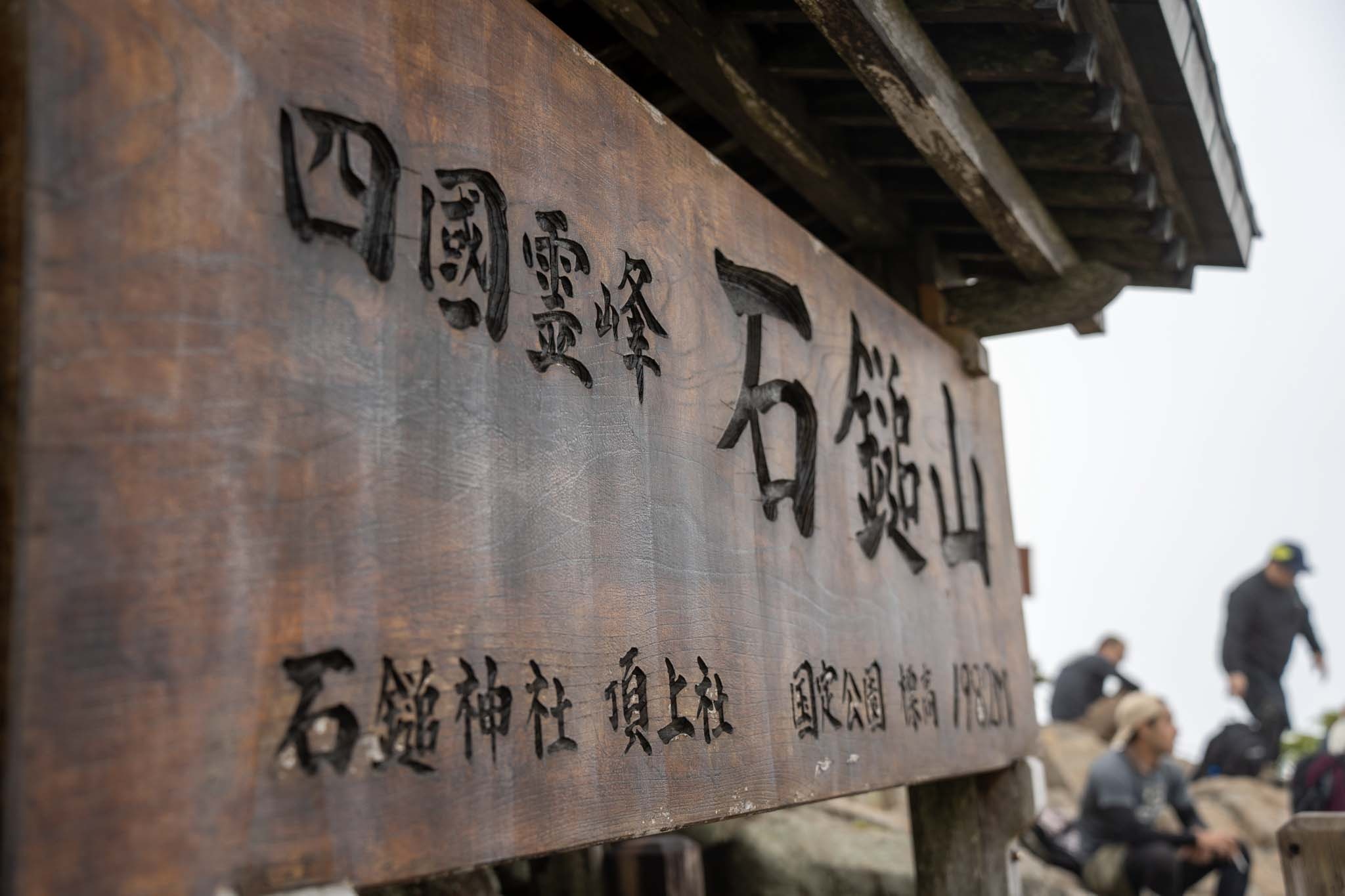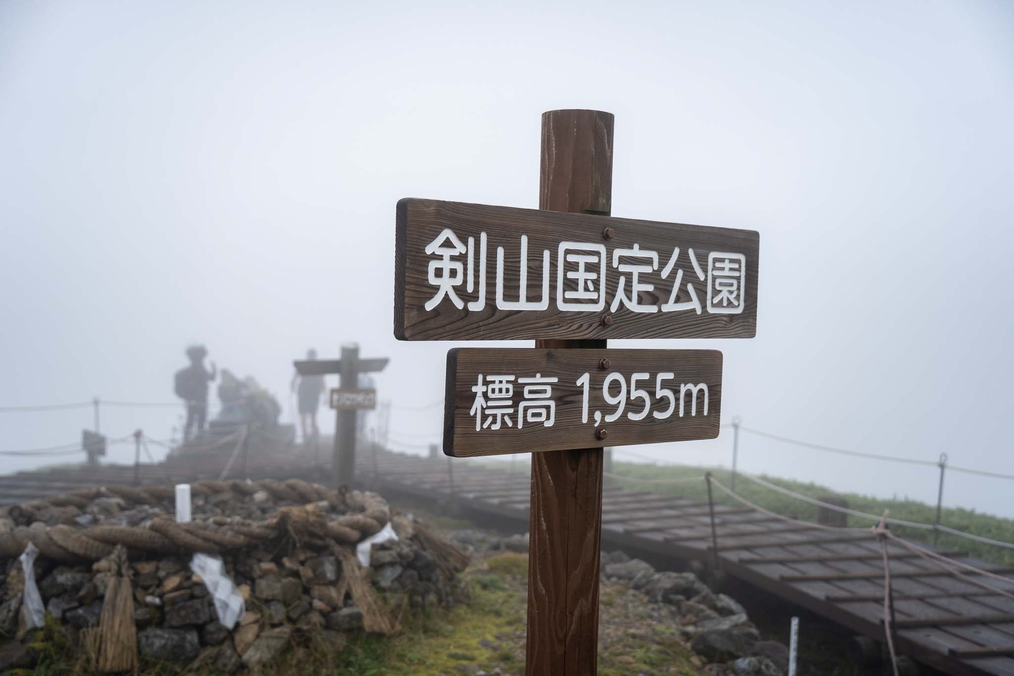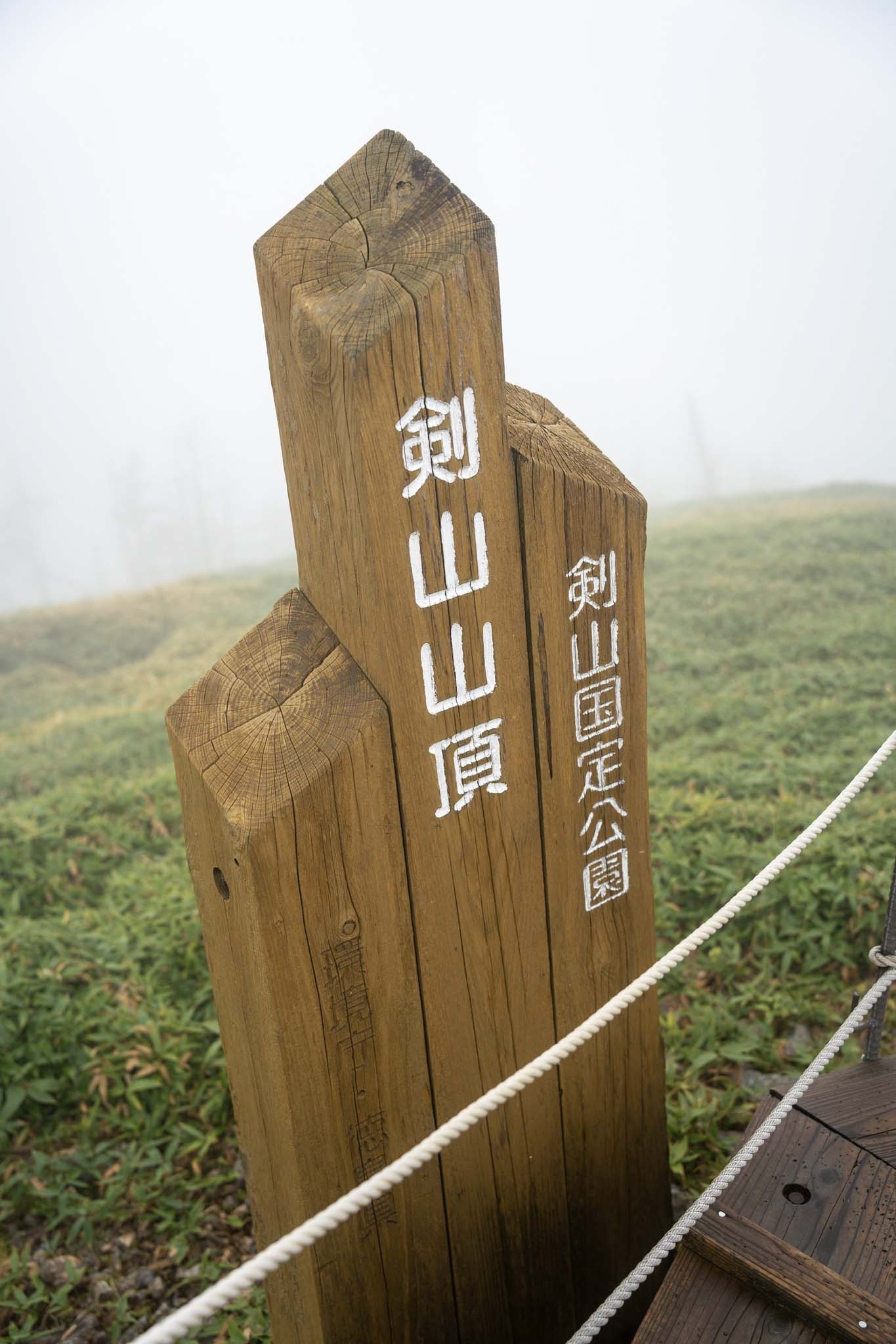 狛犬を過ぎると鳥居が現れ、まもなく劔山本宮についた。山頂ヒュッテとの間の階段を上がると広い大地に出た。木道を進むと剣山山頂の標識についた。西日本第2の頂だ。あいにくガスに覆われ視界はない。この先に次郎笈(じろうぎゅう)に続く雄大な縦走路が延びているはずだがまるで見えなかった。この縦走路を歩くのがこの日の目的だったが残念。視界がない中モチベーションが上がらなかった。