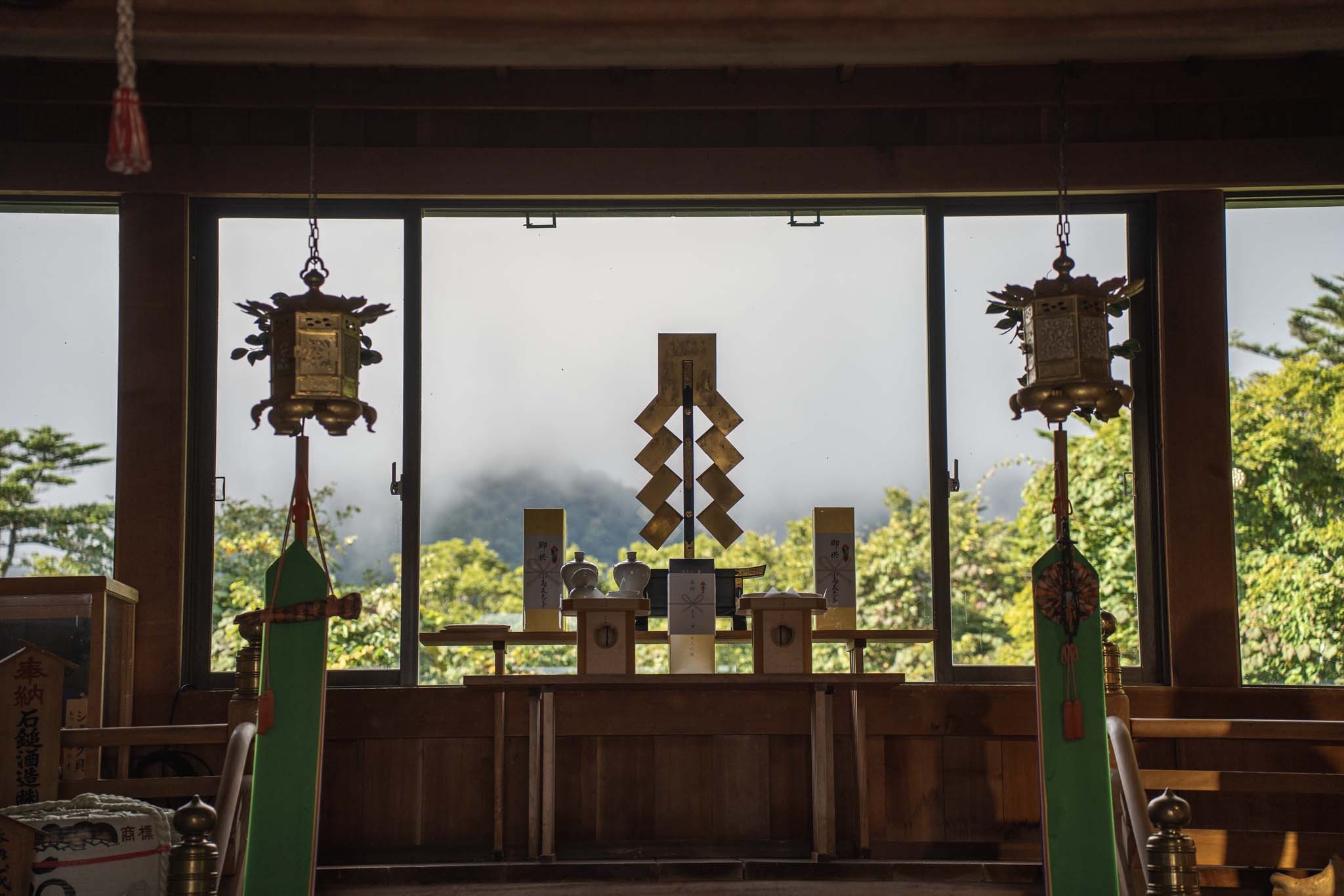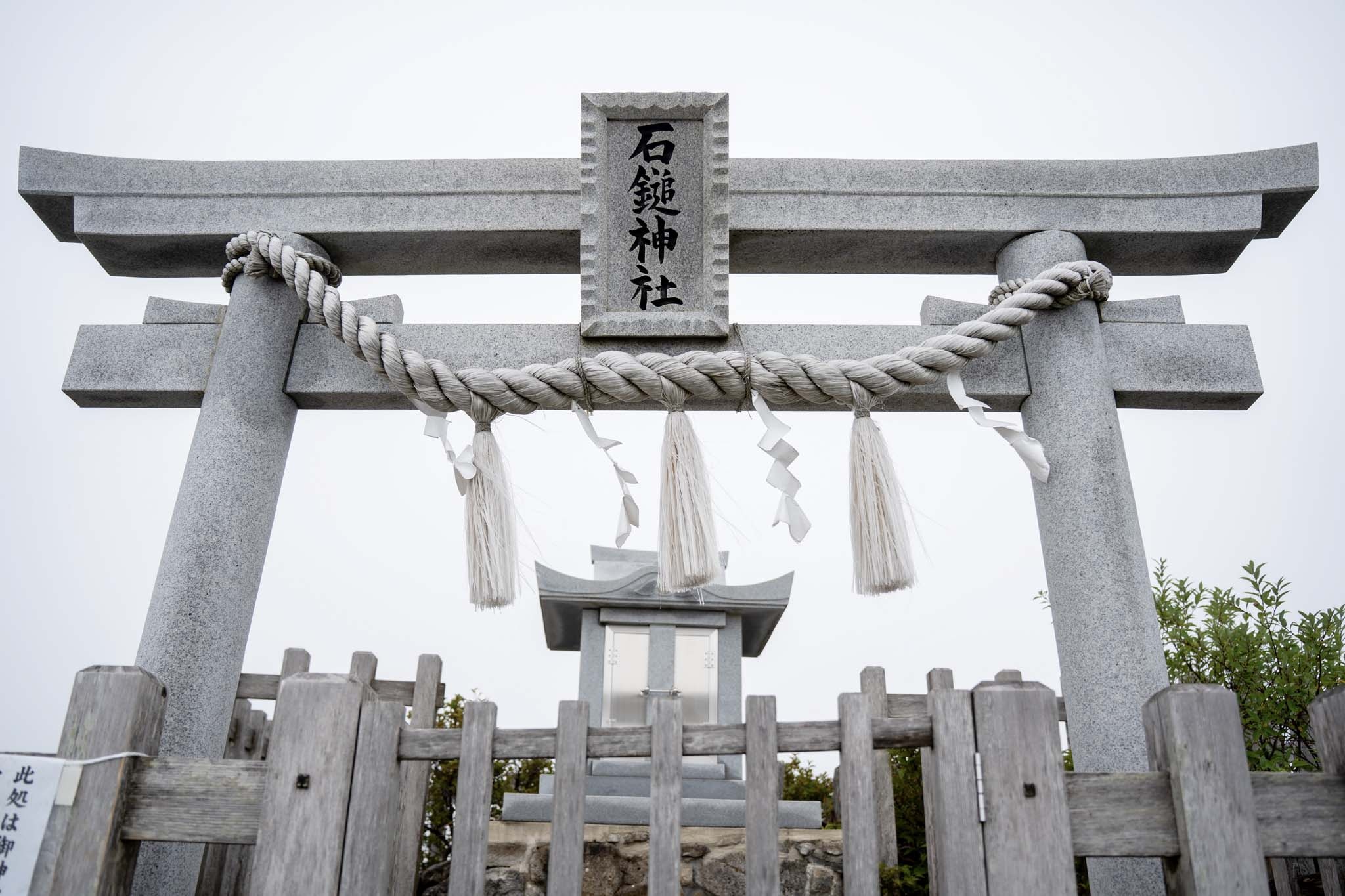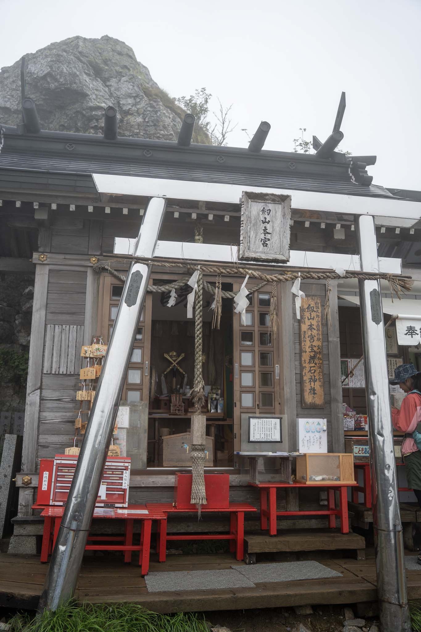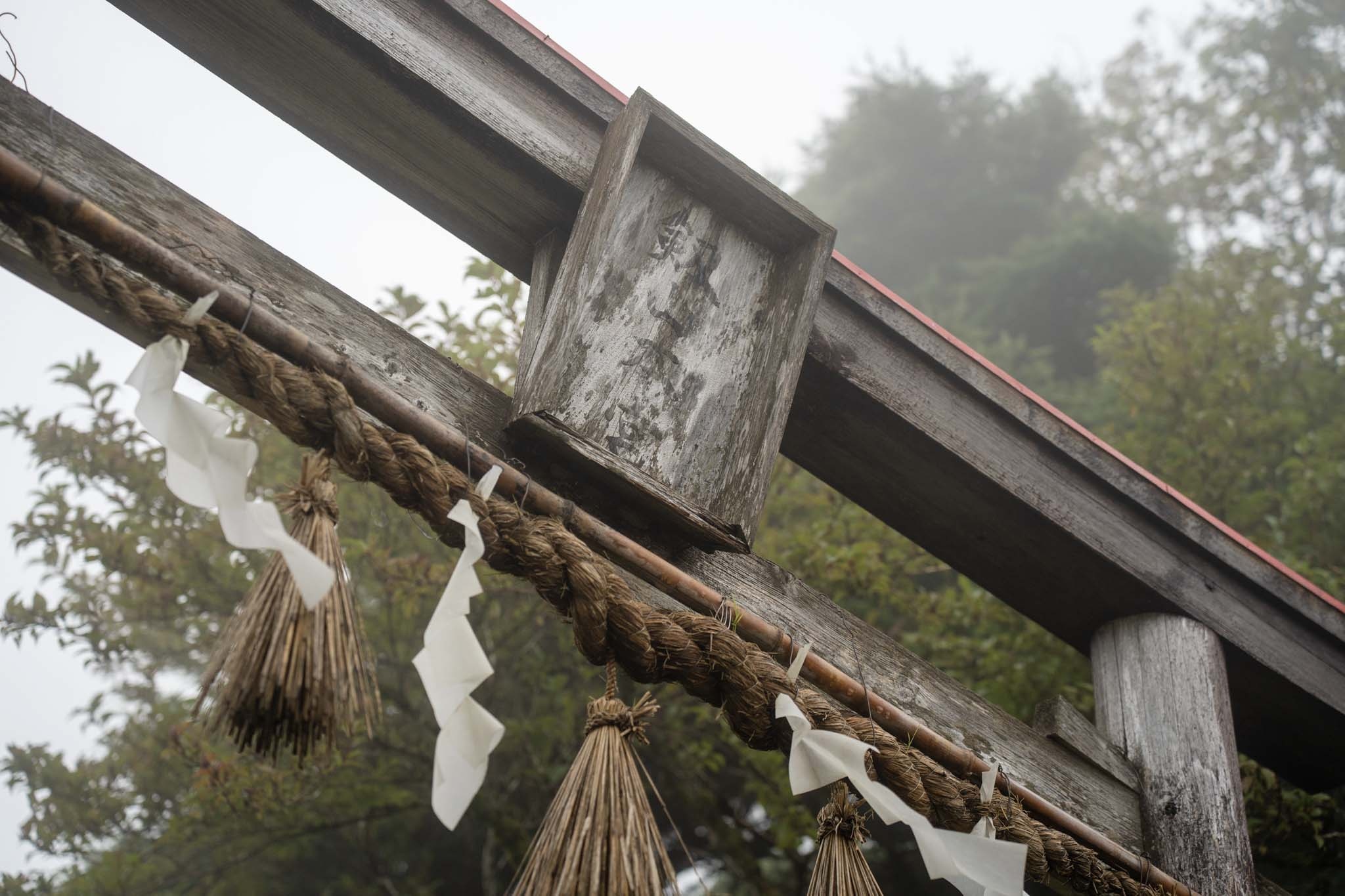 狛犬を過ぎると鳥居が現れ、まもなく劔山本宮についた。山頂ヒュッテとの間の階段を上がると広い大地に出た。木道を進むと剣山山頂の標識についた。西日本第2の頂だ。あいにくガスに覆われ視界はない。この先に次郎笈(じろうぎゅう)に続く雄大な縦走路が延びているはずだがまるで見えなかった。この縦走路を歩くのがこの日の目的だったが残念。視界がない中モチベーションが上がらなかった。
