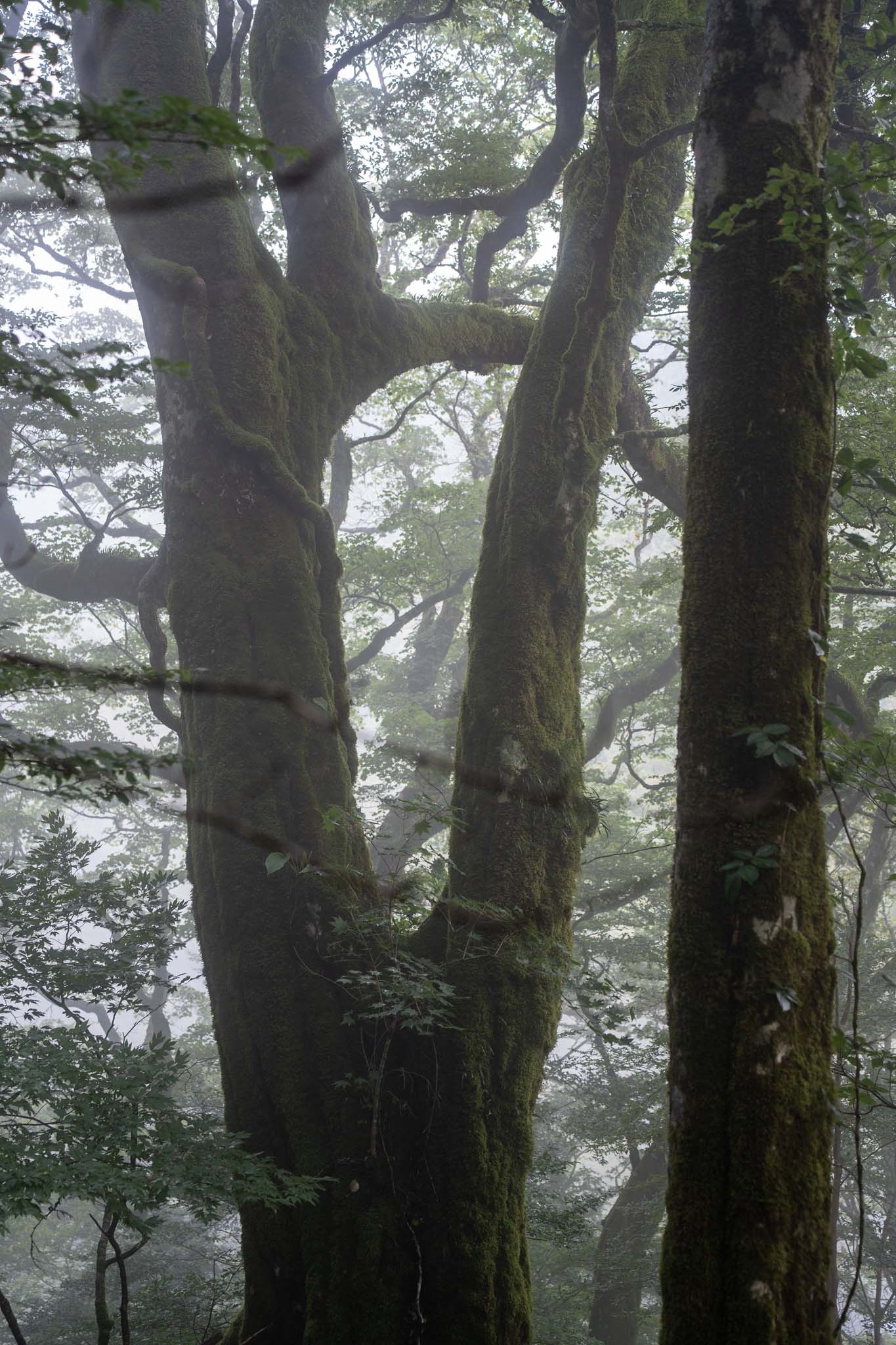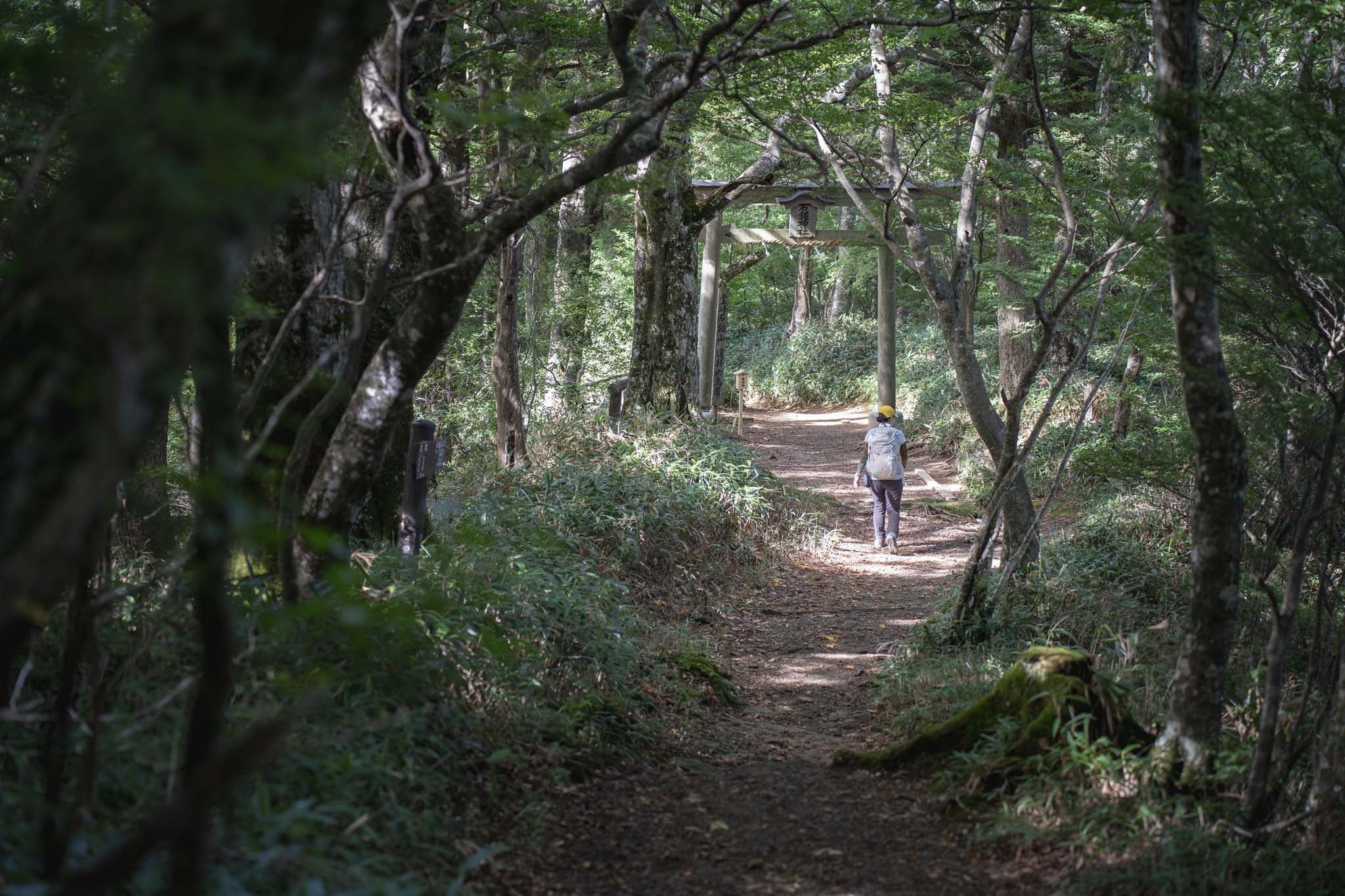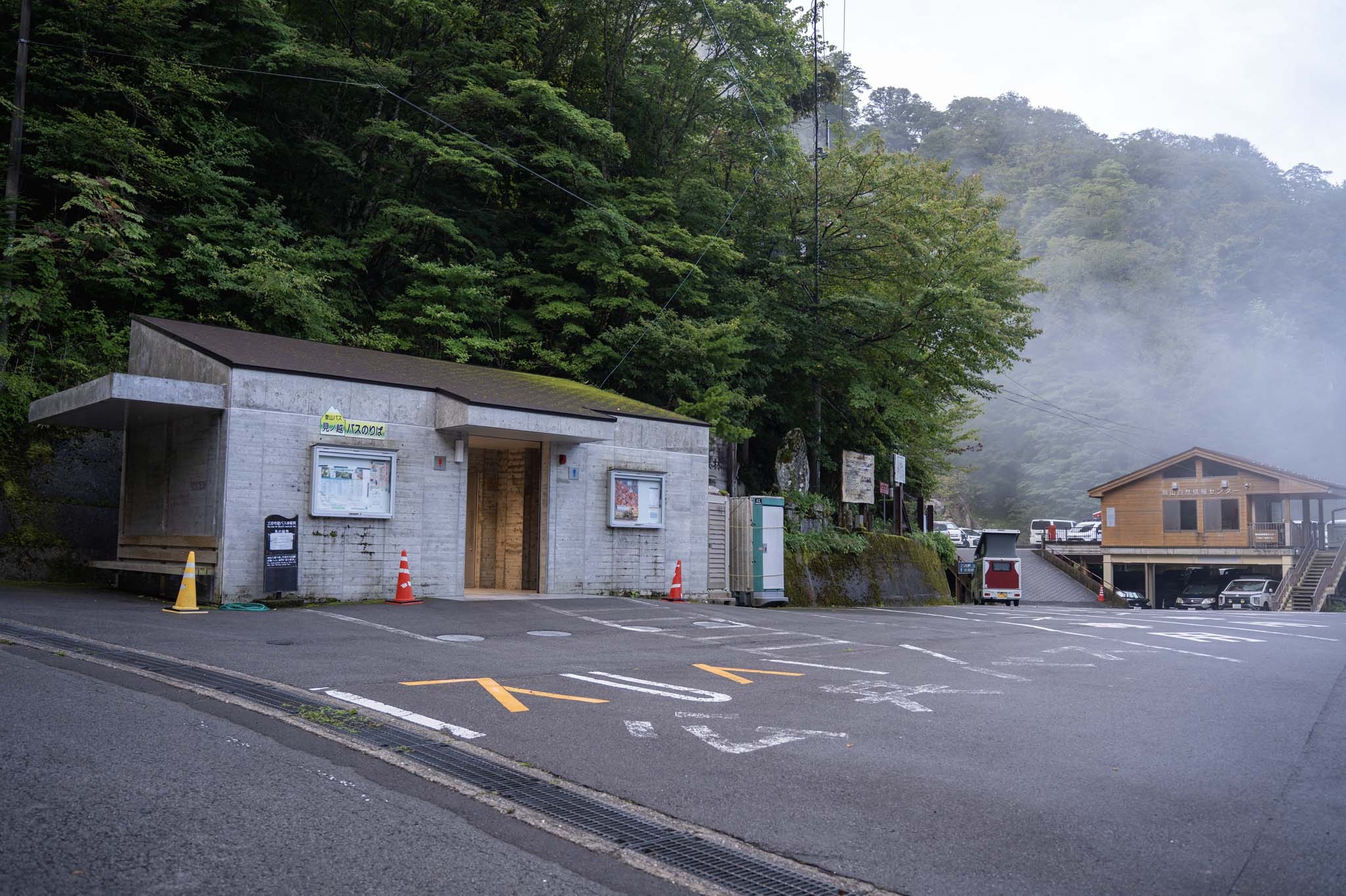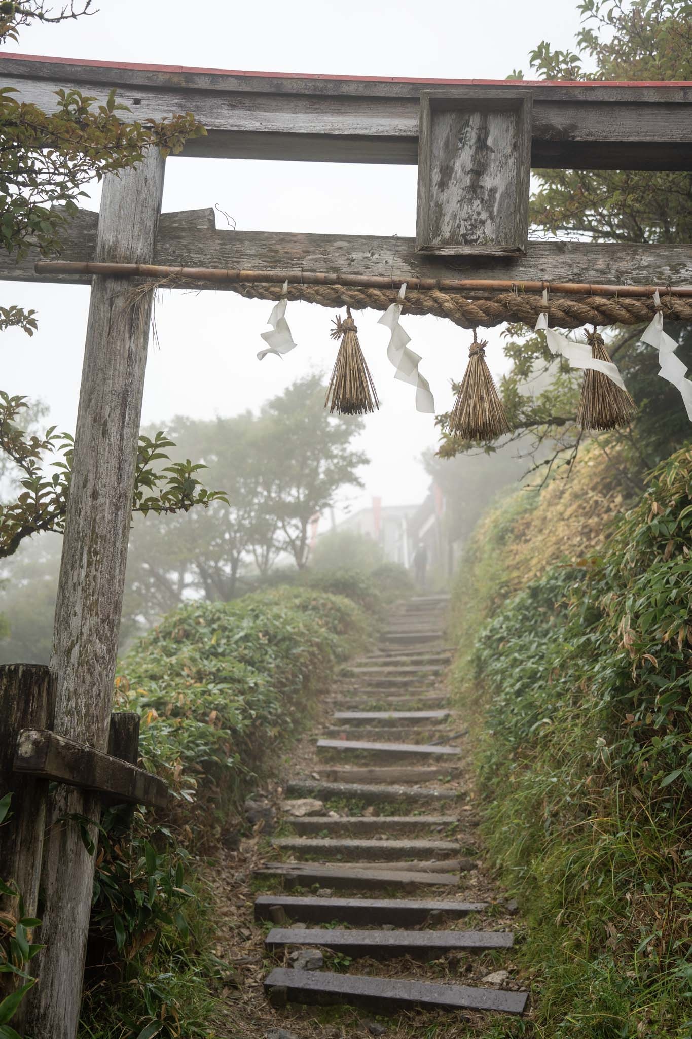 辺りが明るくなってきた頃起床。駐車場は満車。さすがは百名山、人気の山だ。登山道は鳥居がある石段から始まる。劔神社で安全祈願して出発した。霧がかかる九十九折りの道を進んだ。神秘的なブナの大木が迎えてくれる。20分ほどで樹林帯が終わり視界が開けた。野営場を過ぎるとリフトの西島駅につく。