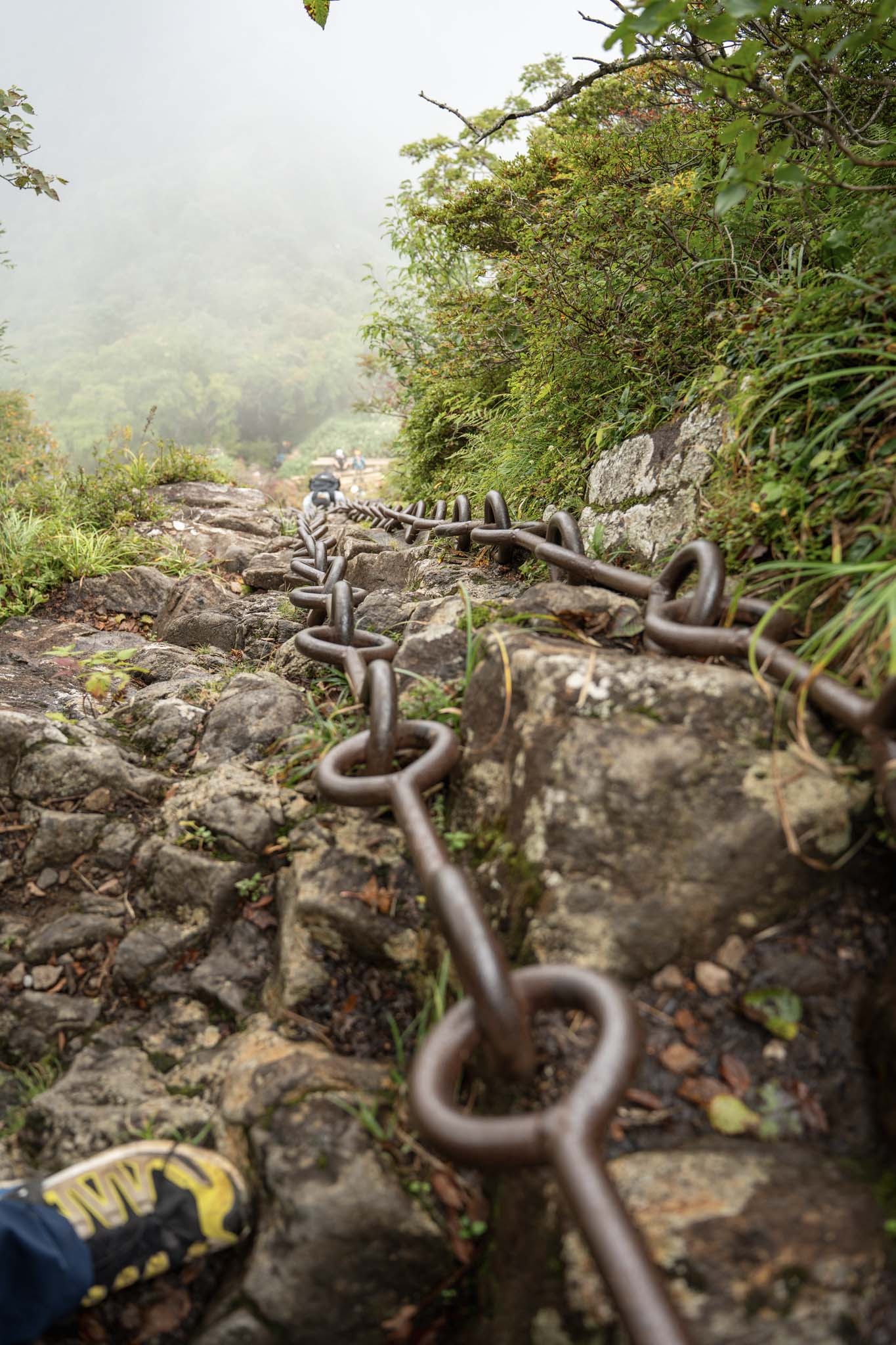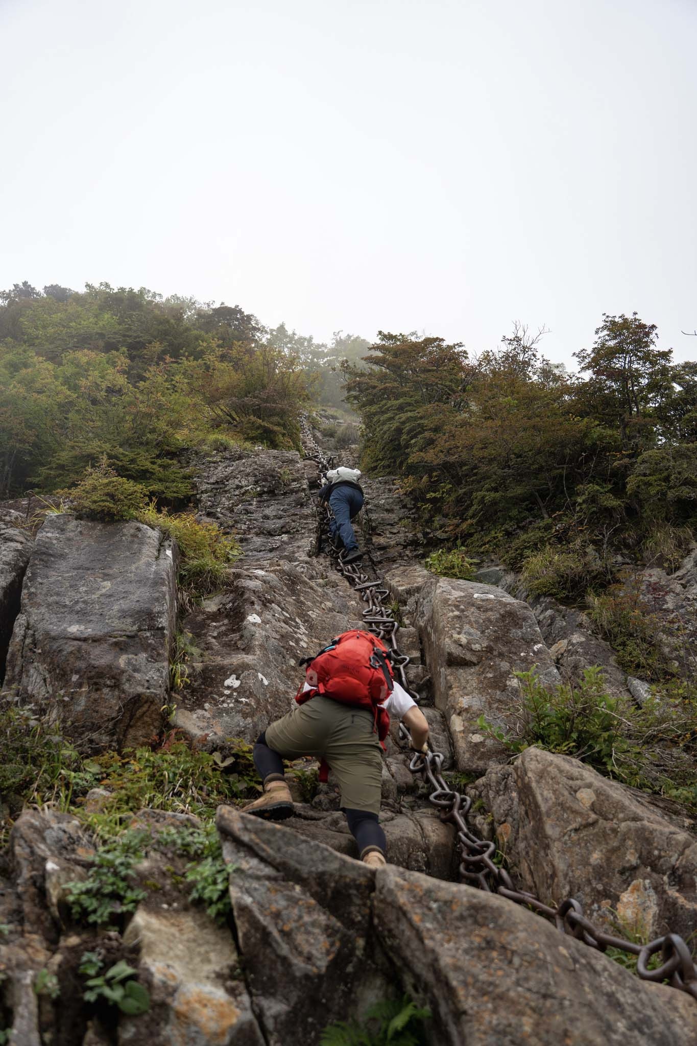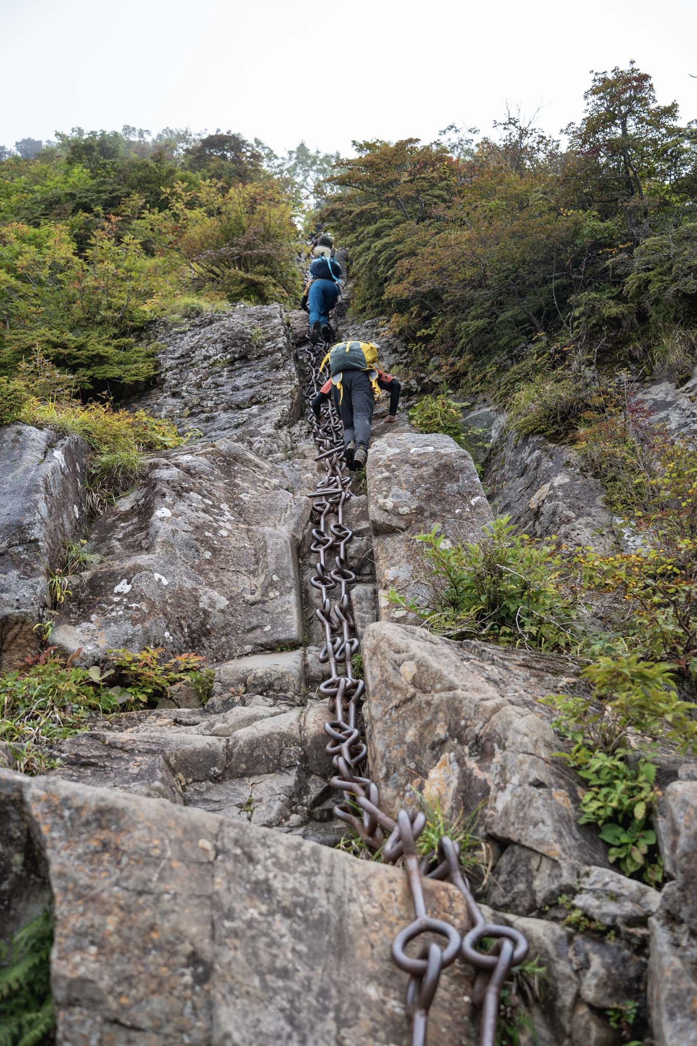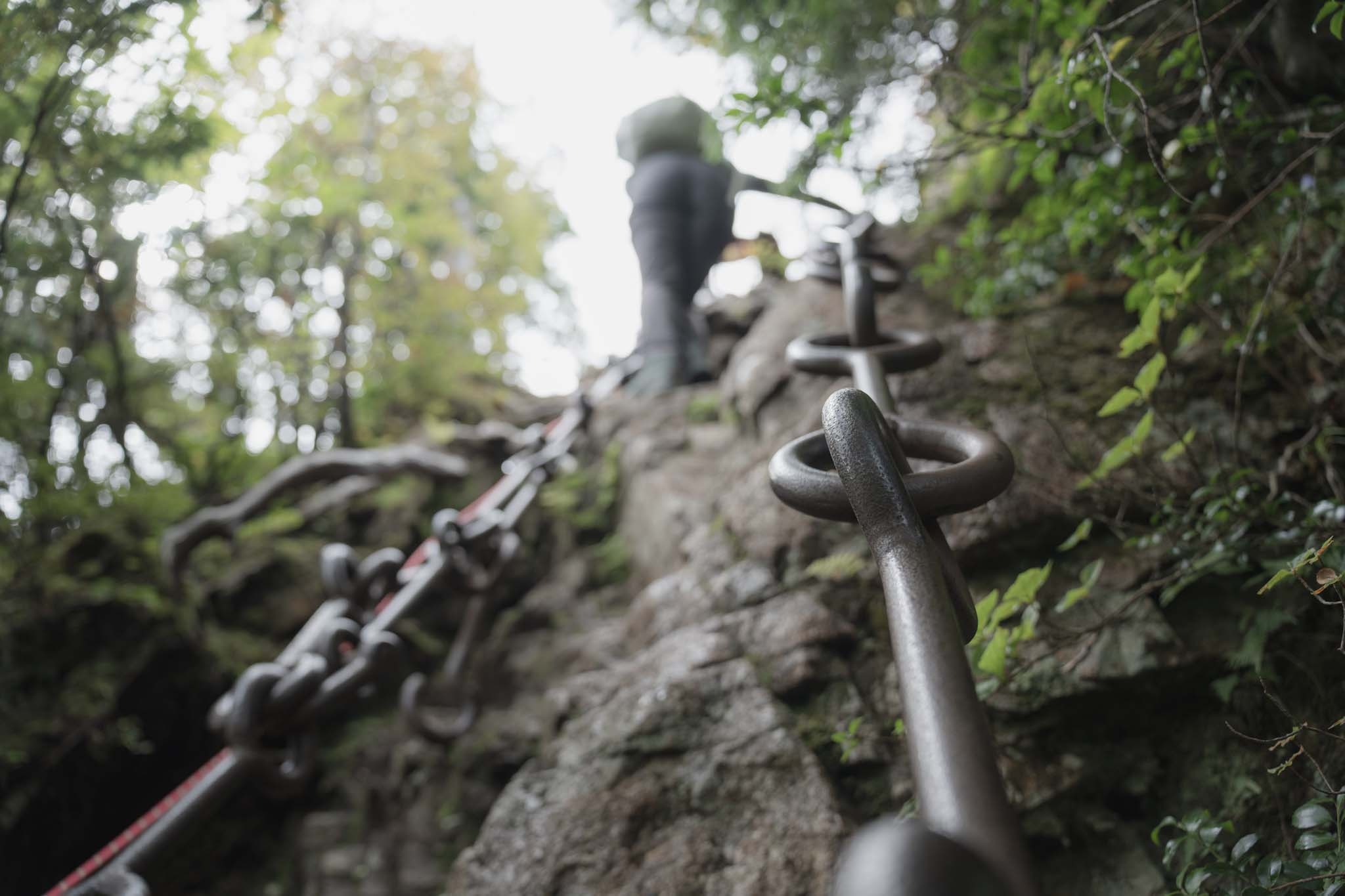 続いて「二の鎖(65m)」。鎖が垂直のように見える岩場に一直線にのびていた。途中ハングしているいやらしい箇所があって女性が難儀していた。相変わらず足場が滑りやすいため、鎖の連結部の丸い輪に足先を突っ込んで足場にしながら登った。要所に三角形の鎖がつけられていて助けられた。