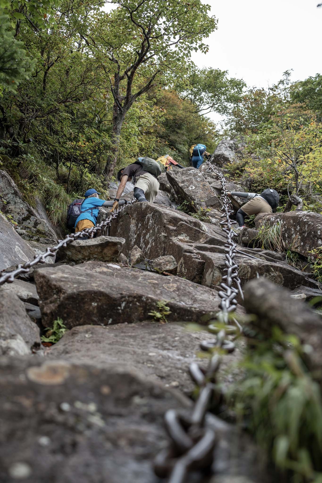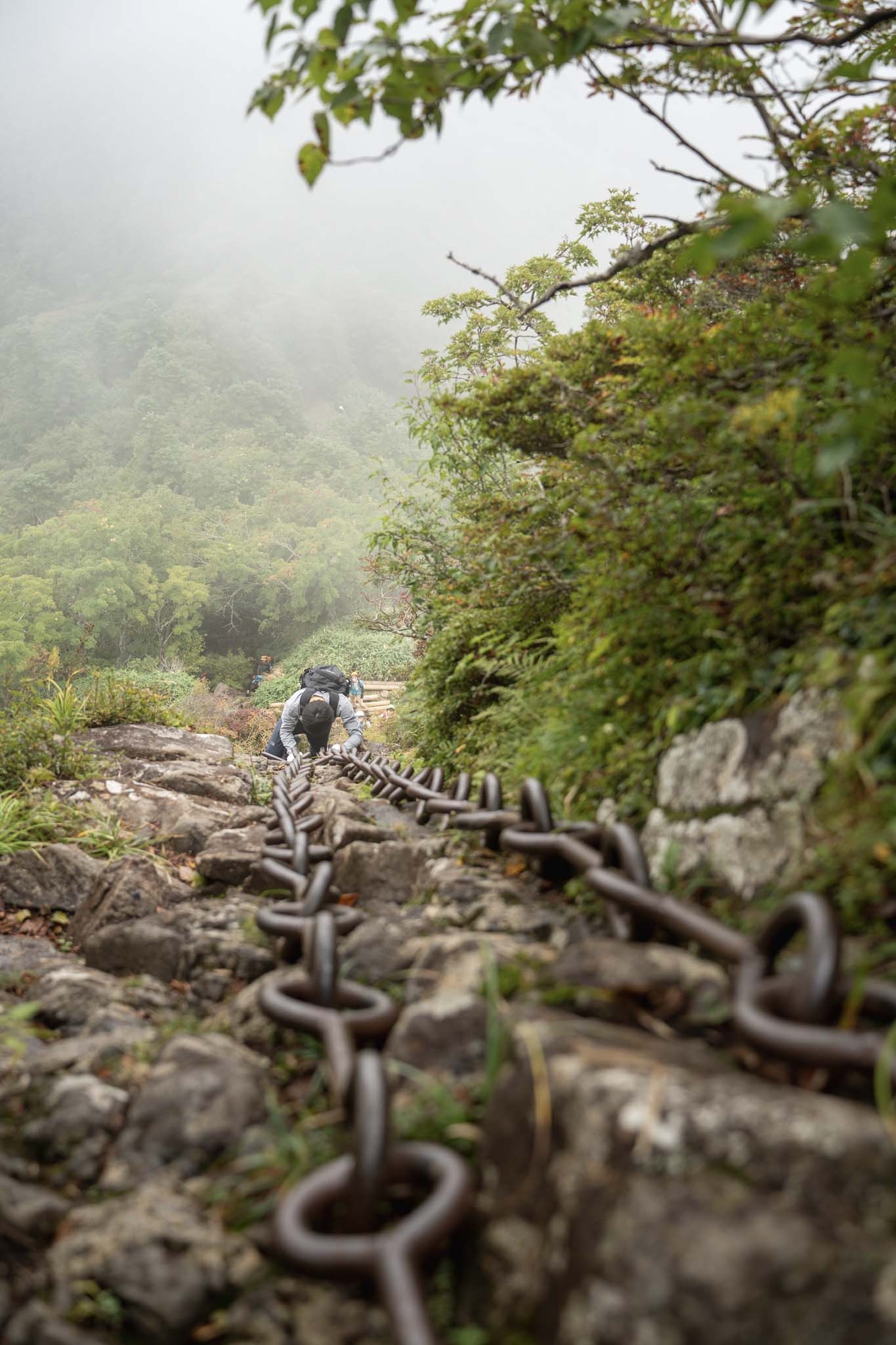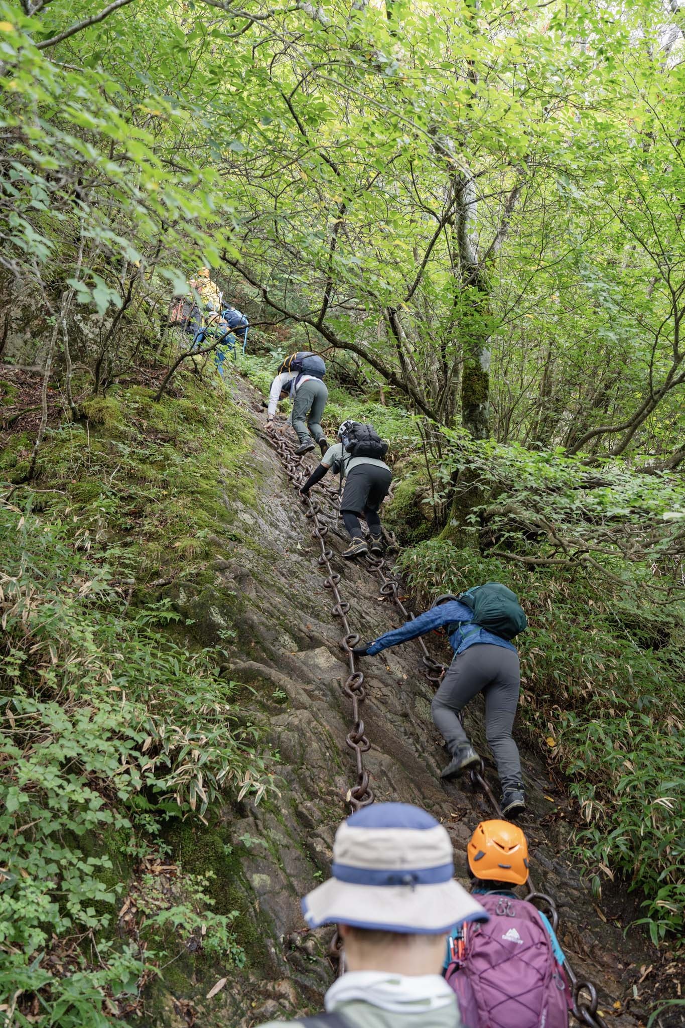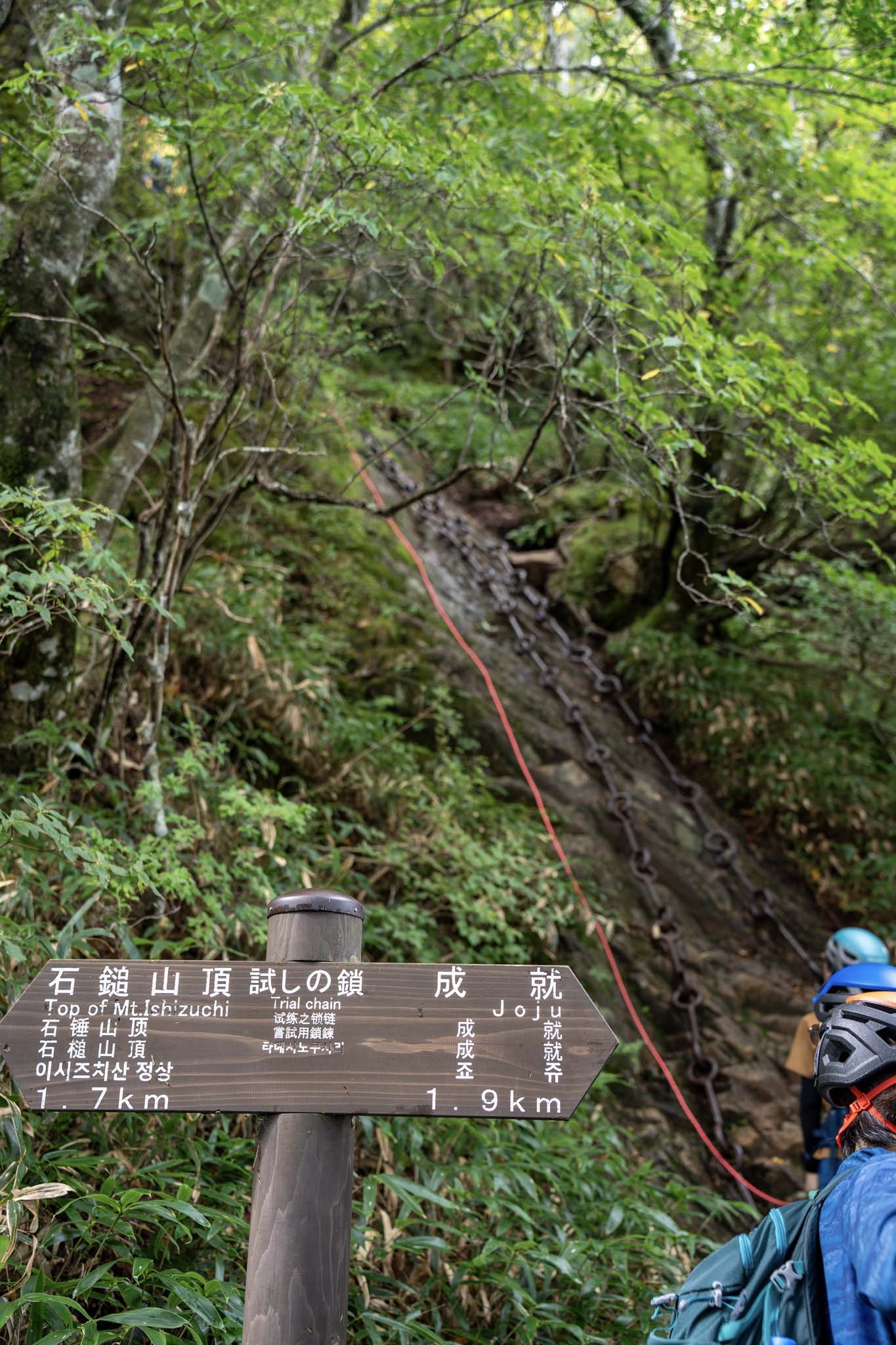 続いて「二の鎖(65m)」。鎖が垂直のように見える岩場に一直線にのびていた。途中ハングしているいやらしい箇所があって女性が難儀していた。相変わらず足場が滑りやすいため、鎖の連結部の丸い輪に足先を突っ込んで足場にしながら登った。要所に三角形の鎖がつけられていて助けられた。