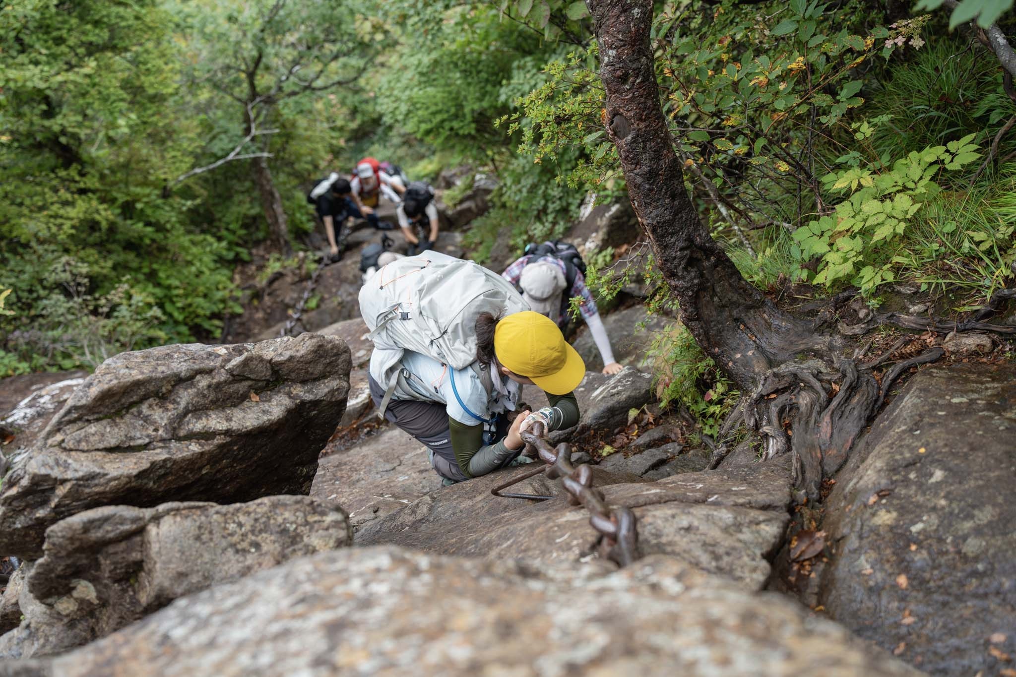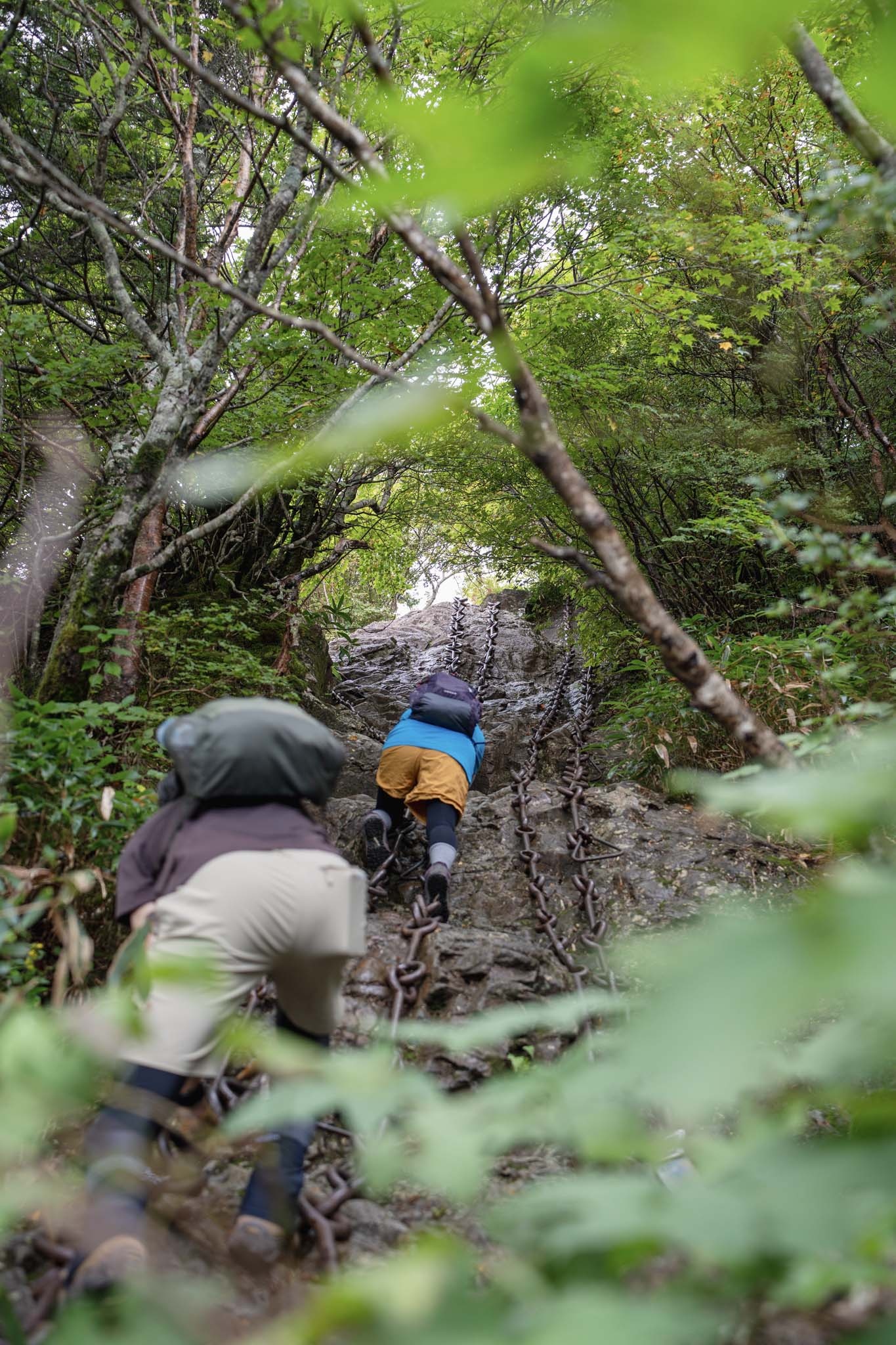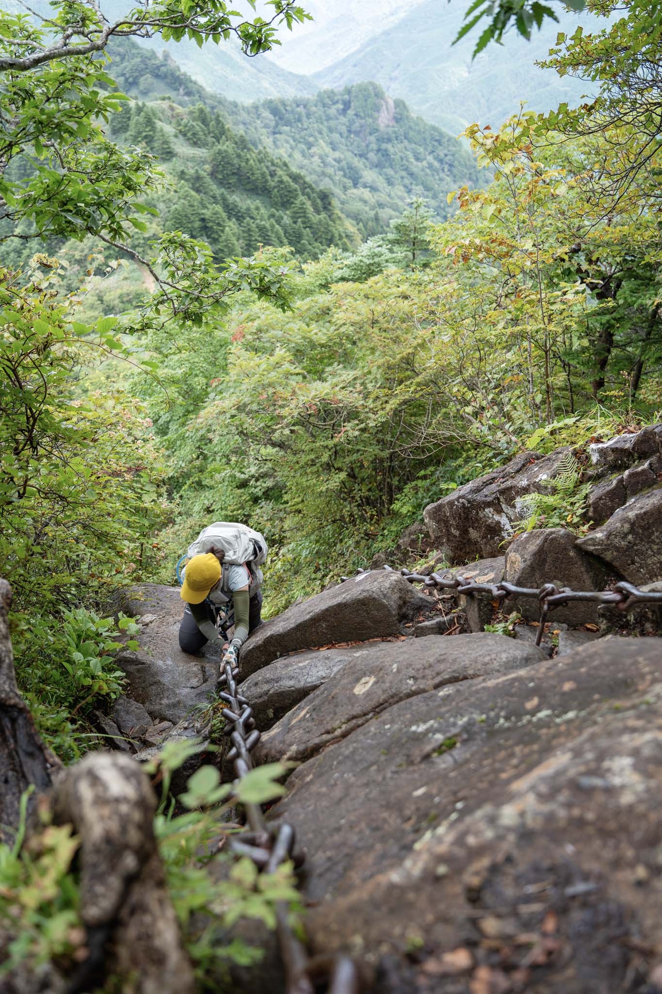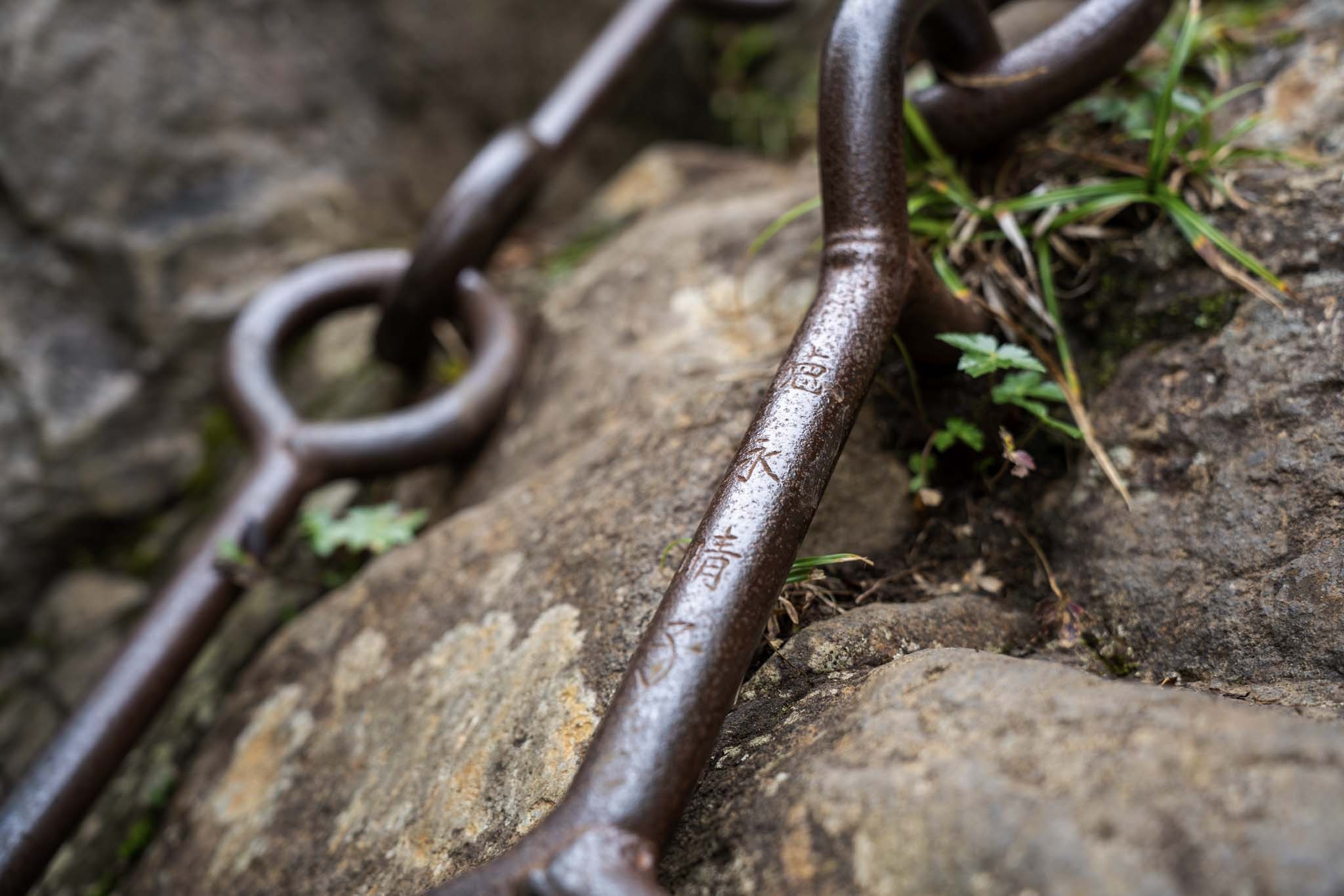 続いて「二の鎖(65m)」。鎖が垂直のように見える岩場に一直線にのびていた。途中ハングしているいやらしい箇所があって女性が難儀していた。相変わらず足場が滑りやすいため、鎖の連結部の丸い輪に足先を突っ込んで足場にしながら登った。要所に三角形の鎖がつけられていて助けられた。