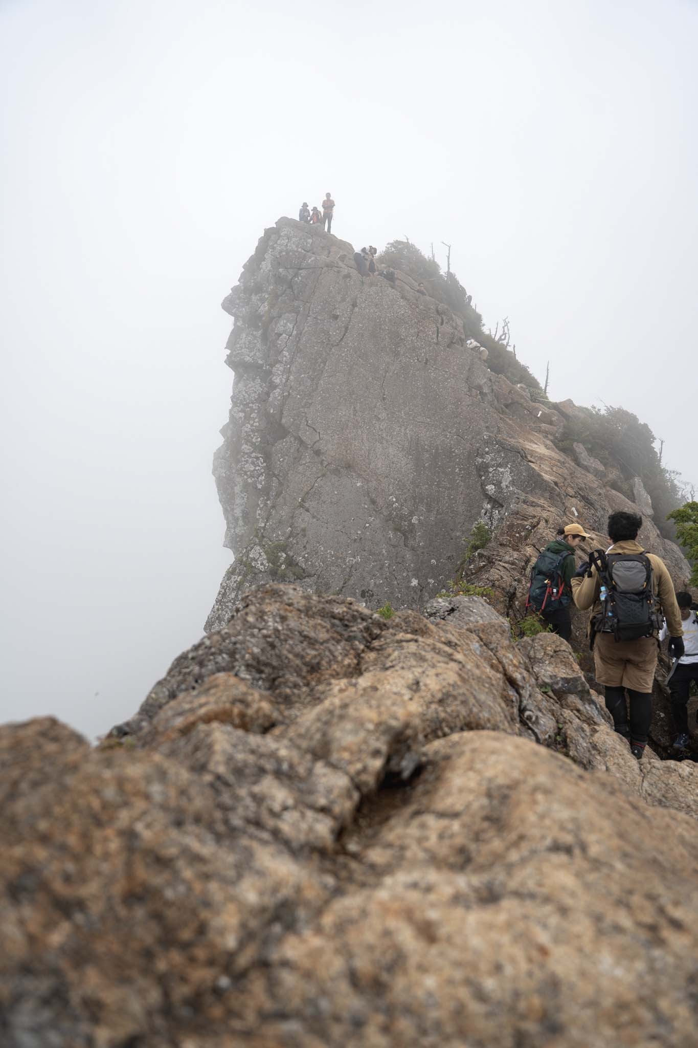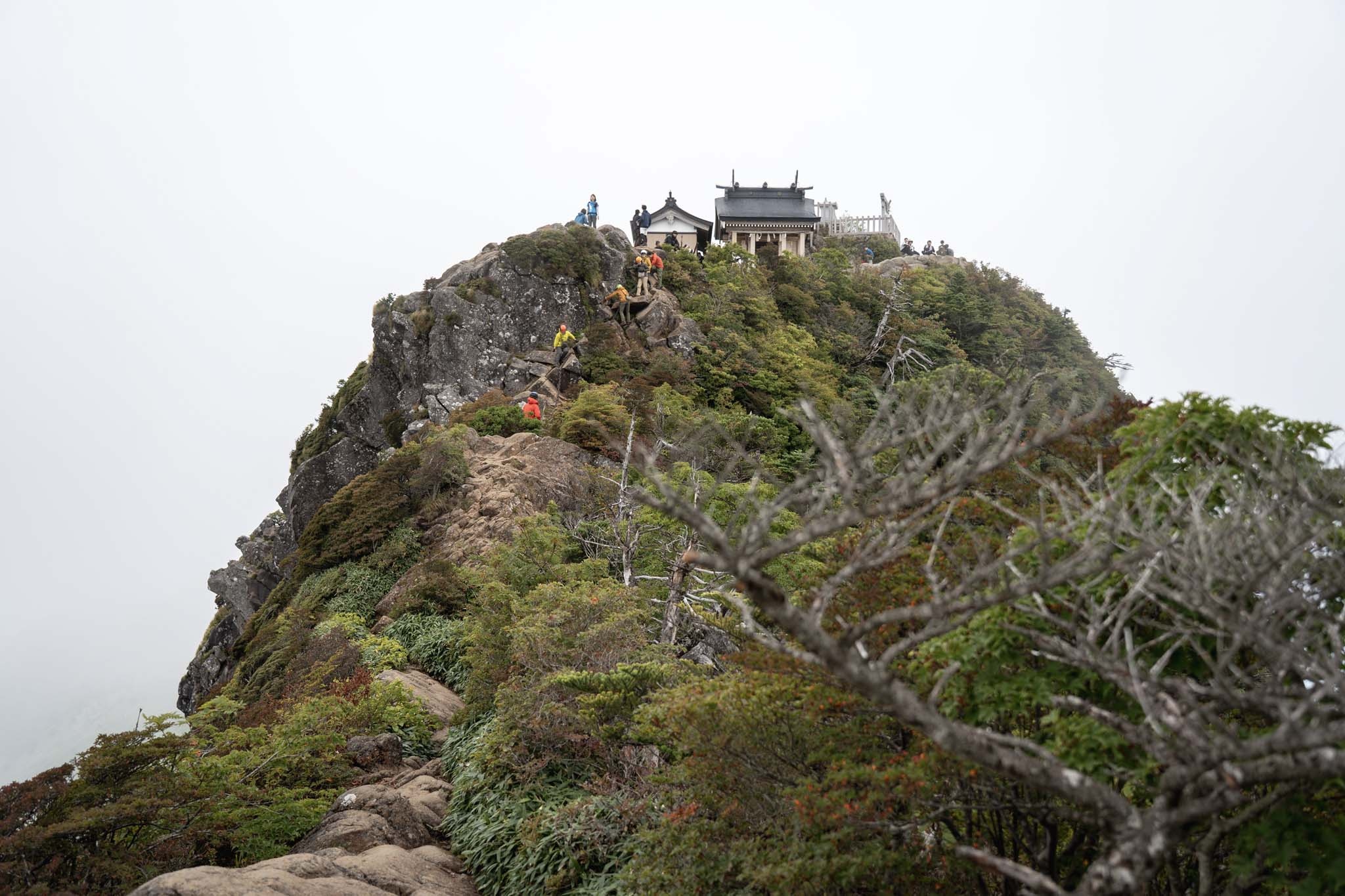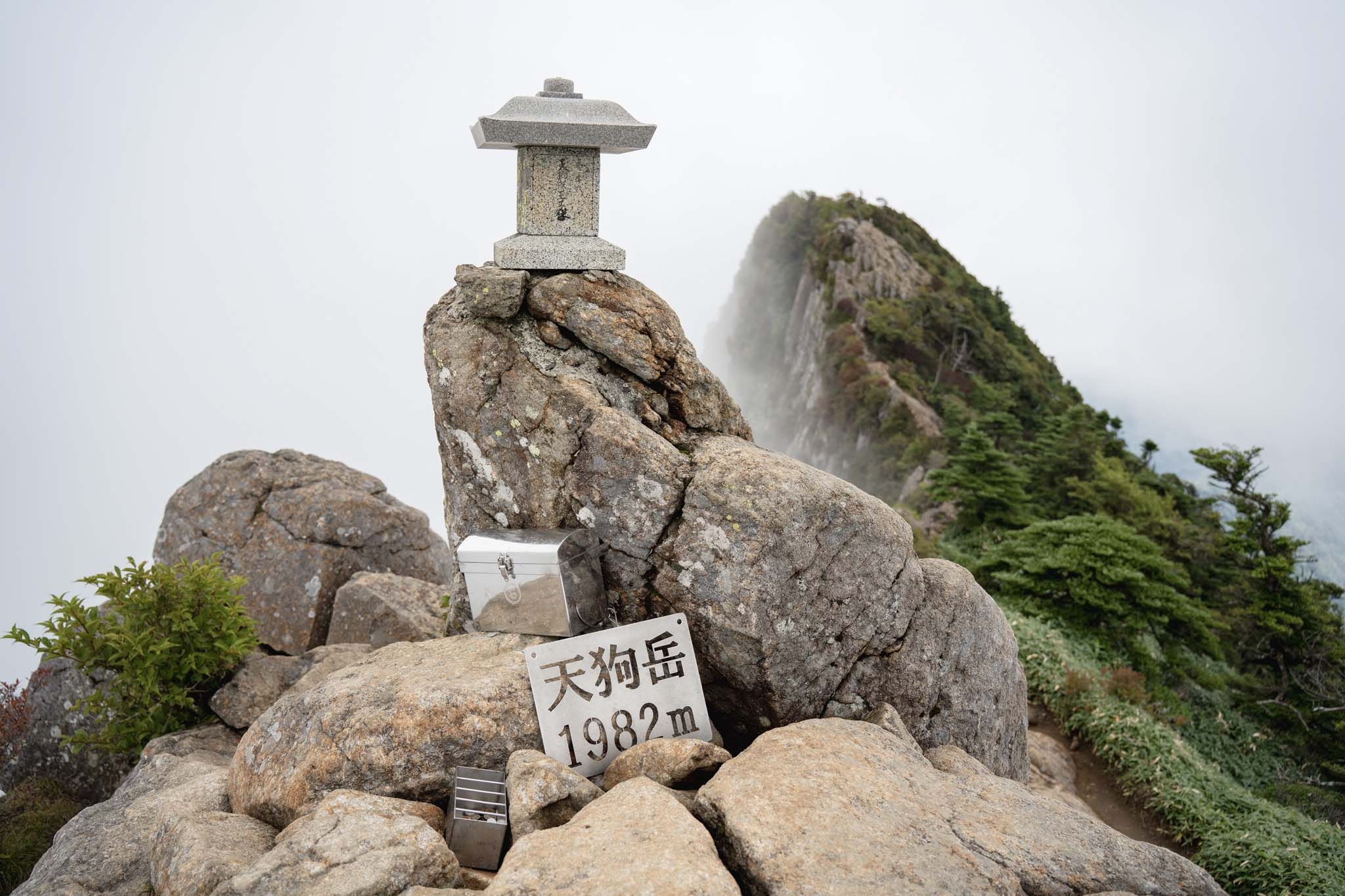 弥山では多くの人が登頂を喜んでいた。インスタでよく見る弥山からの天狗岳も目の前だ。ガスがかかって幻想的だった。荷物をデポして天狗岳を目指した。途中の細尾根がよく見える。緊張しながら出発。強い風とガスがかすめる稜線を進む。尾根の左側は完全に切れ落ちている。右側の踏み道をたどった。しばらくいくと道はなくなりナイフリッジの岩場に誘導された。ここが核心部。横からの強風に煽られながら4点歩行で慎重に通過した。岩場を抜けると小さな祠が見えてきた。「天狗岳1982m」の看板。西日本最高峰に到達した。尾根の先には南尖峰1982mが見える。同じ標高でこちらも西日本最高峰だ。さすがは修験の山。なかなか登りごたえがあった。