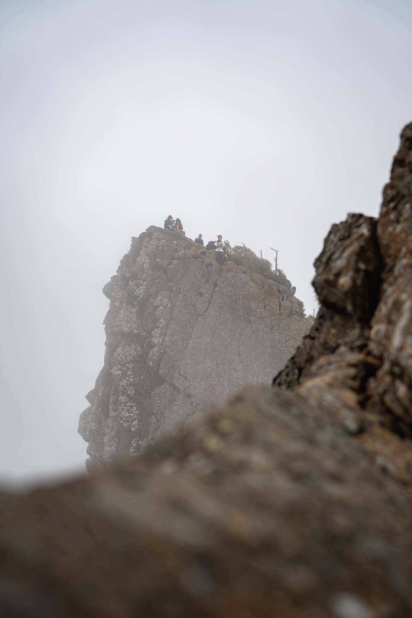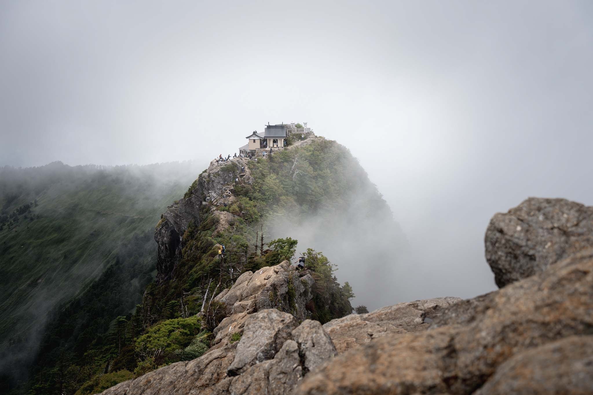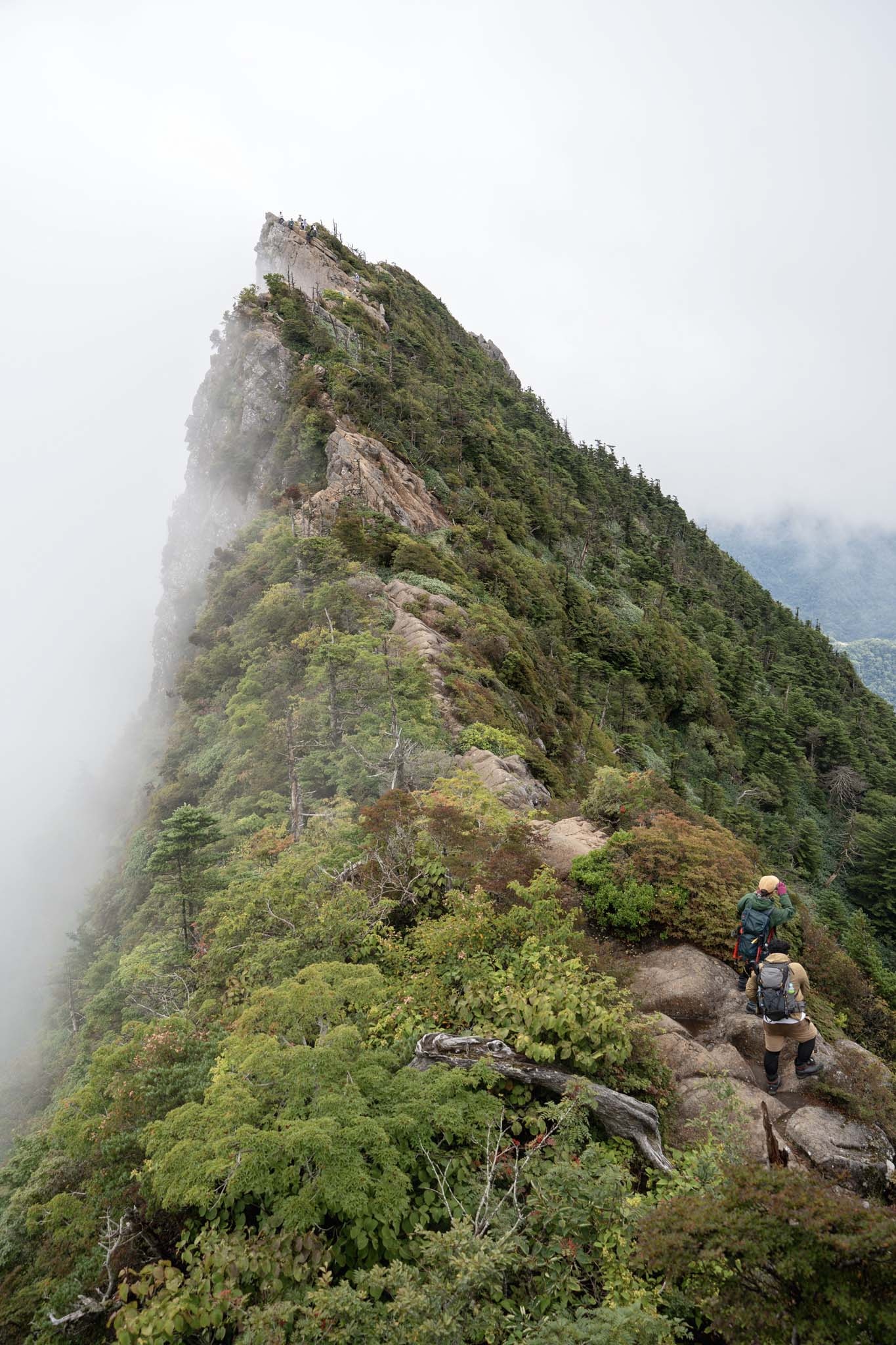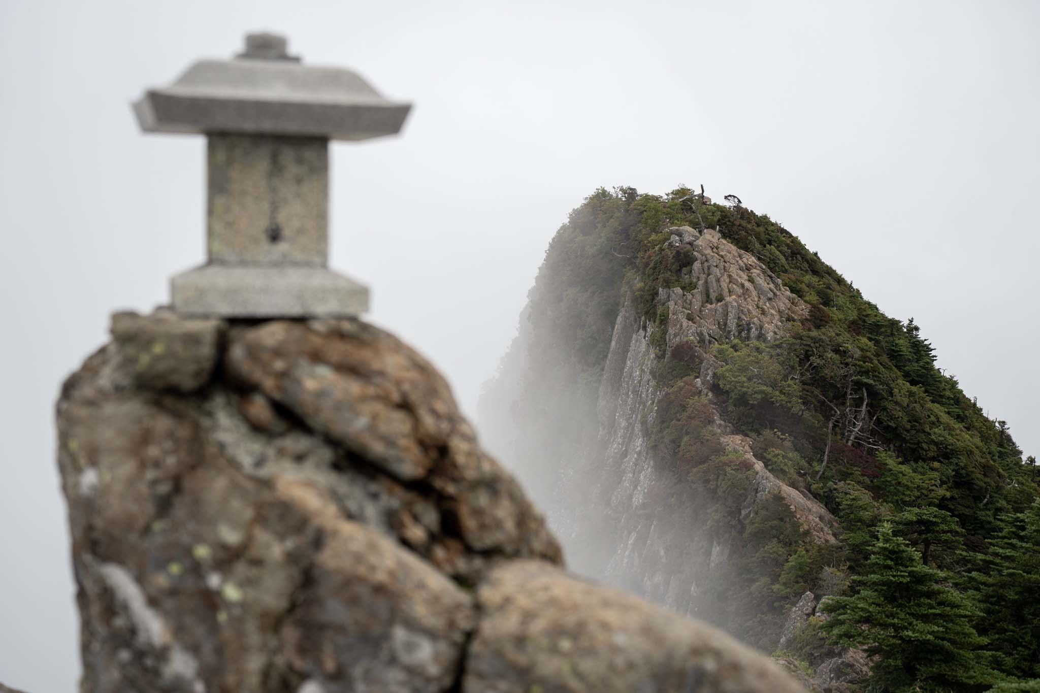 弥山では多くの人が登頂を喜んでいた。インスタでよく見る弥山からの天狗岳も目の前だ。ガスがかかって幻想的だった。荷物をデポして天狗岳を目指した。途中の細尾根がよく見える。緊張しながら出発。強い風とガスがかすめる稜線を進む。尾根の左側は完全に切れ落ちている。右側の踏み道をたどった。しばらくいくと道はなくなりナイフリッジの岩場に誘導された。ここが核心部。横からの強風に煽られながら4点歩行で慎重に通過した。岩場を抜けると小さな祠が見えてきた。「天狗岳1982m」の看板。西日本最高峰に到達した。尾根の先には南尖峰1982mが見える。同じ標高でこちらも西日本最高峰だ。さすがは修験の山。なかなか登りごたえがあった。