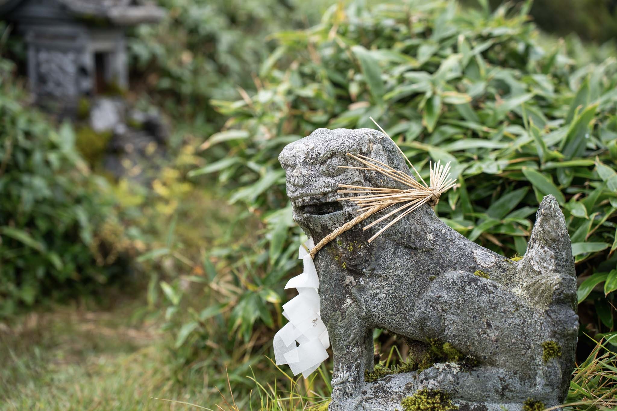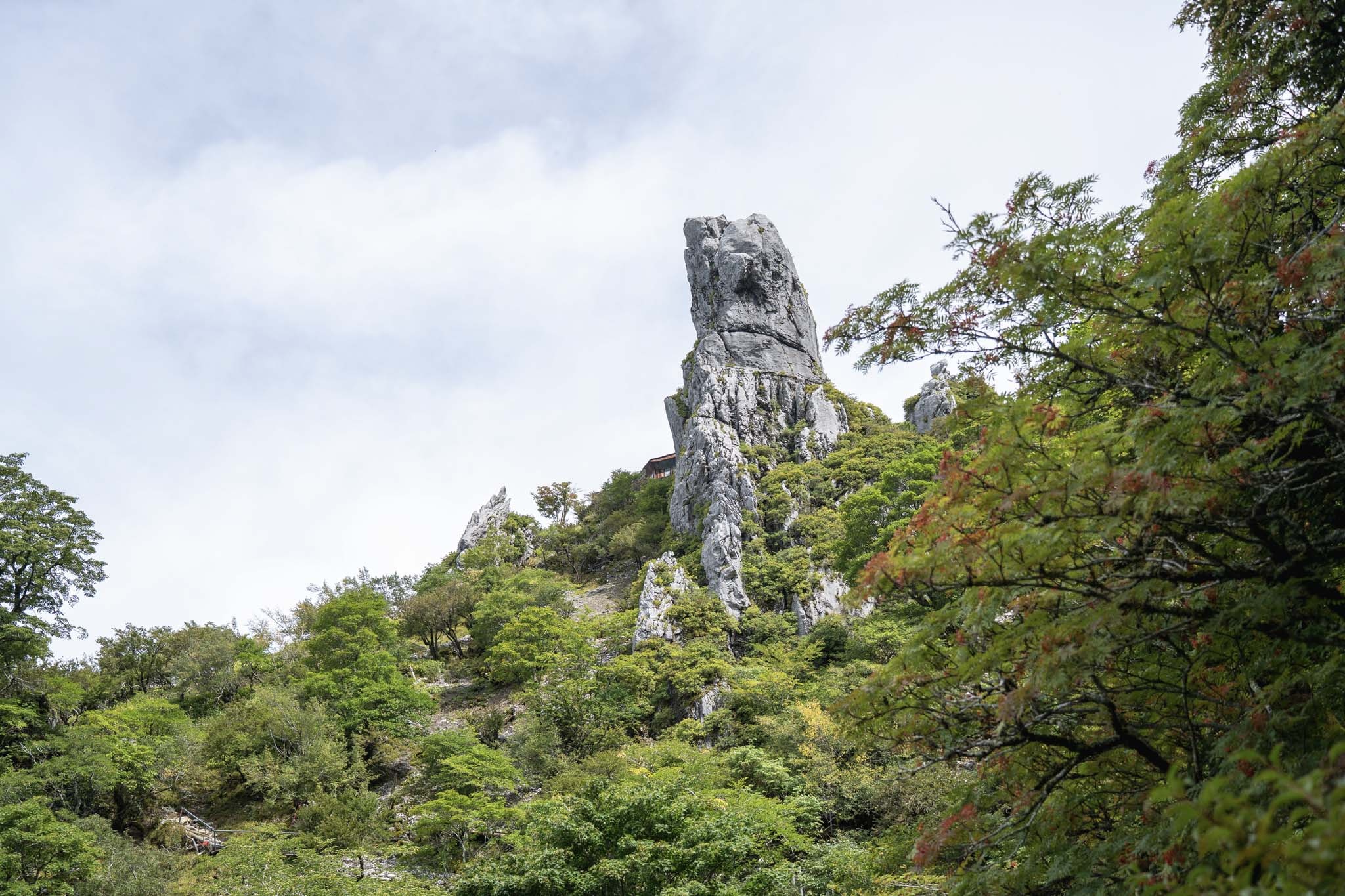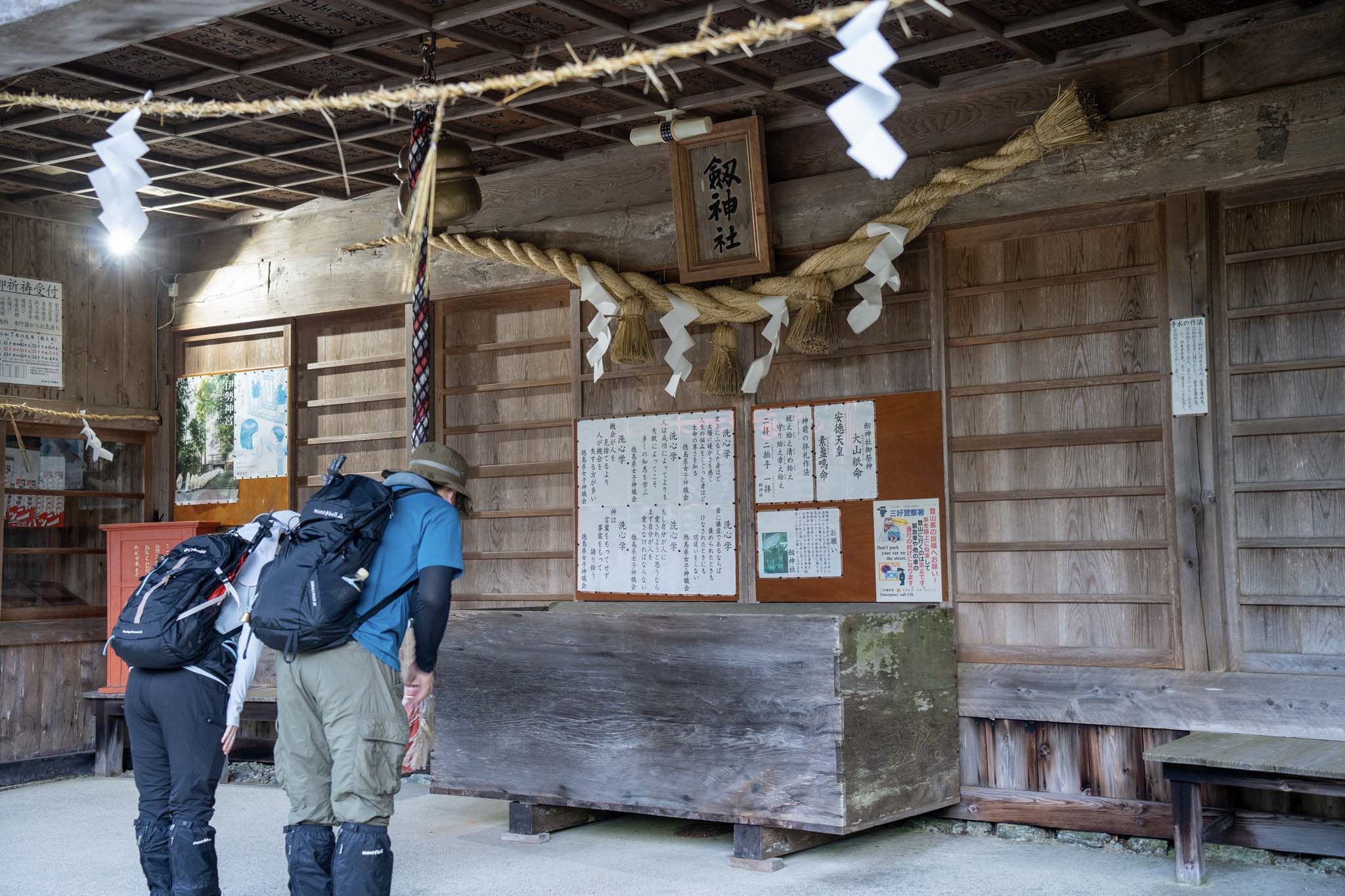 下山は剣山に行く途中からのトラバース道を通った。振り返ると相変わらず見事な次郎笈が鎮座していた。しばらく進むと尖った岩の袂に建物が見えた。大劔神社だ。このシンボリックな岩は「御塔石(おとうせき)」と呼ばれ、剣山の名前は剣のようなこの御塔石が由来らしい。御塔石から湧き出た御神水で喉を潤した。そうして群生するシコクブシ(トリカブト)やシコクフウロに癒されながら下山し、四国霊峰巡礼の旅は終了した。