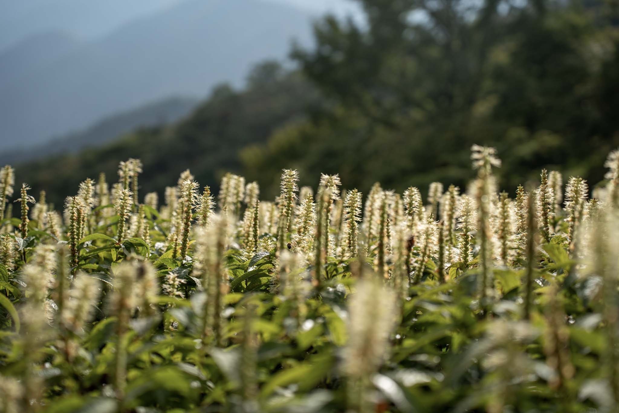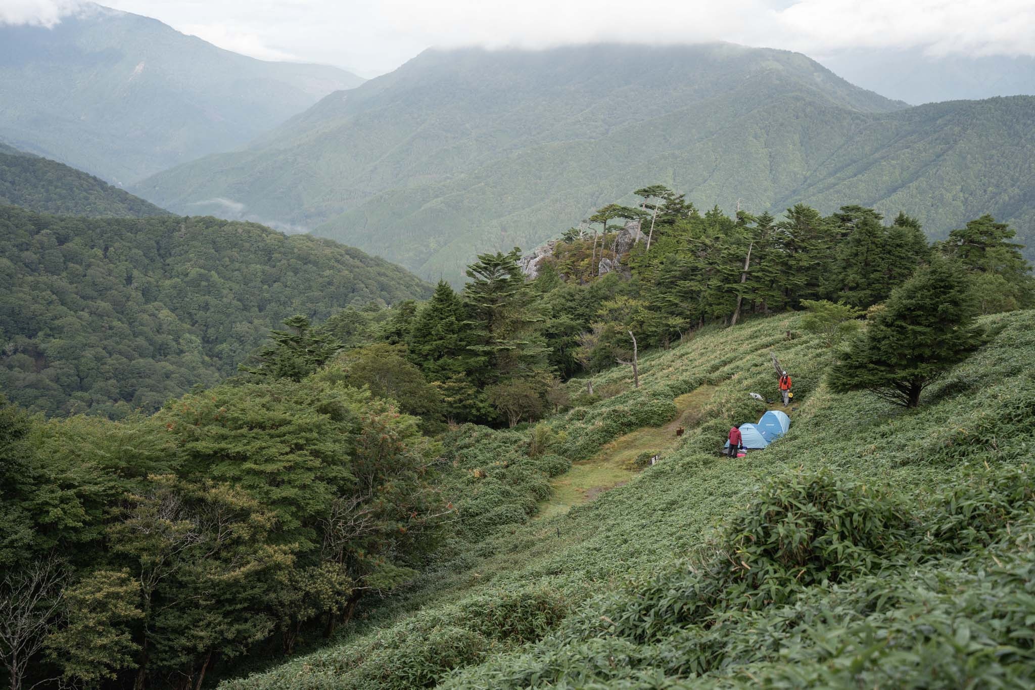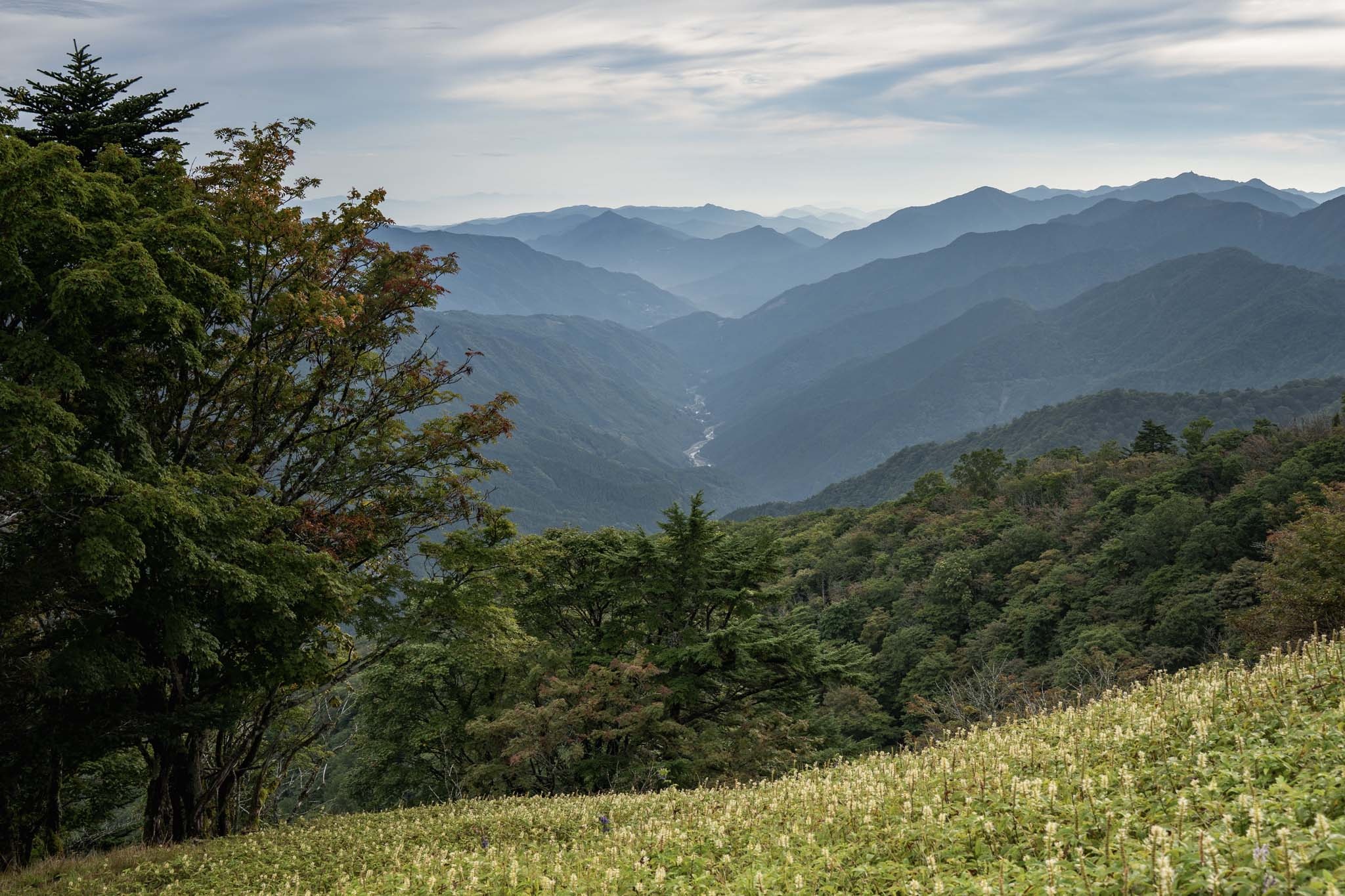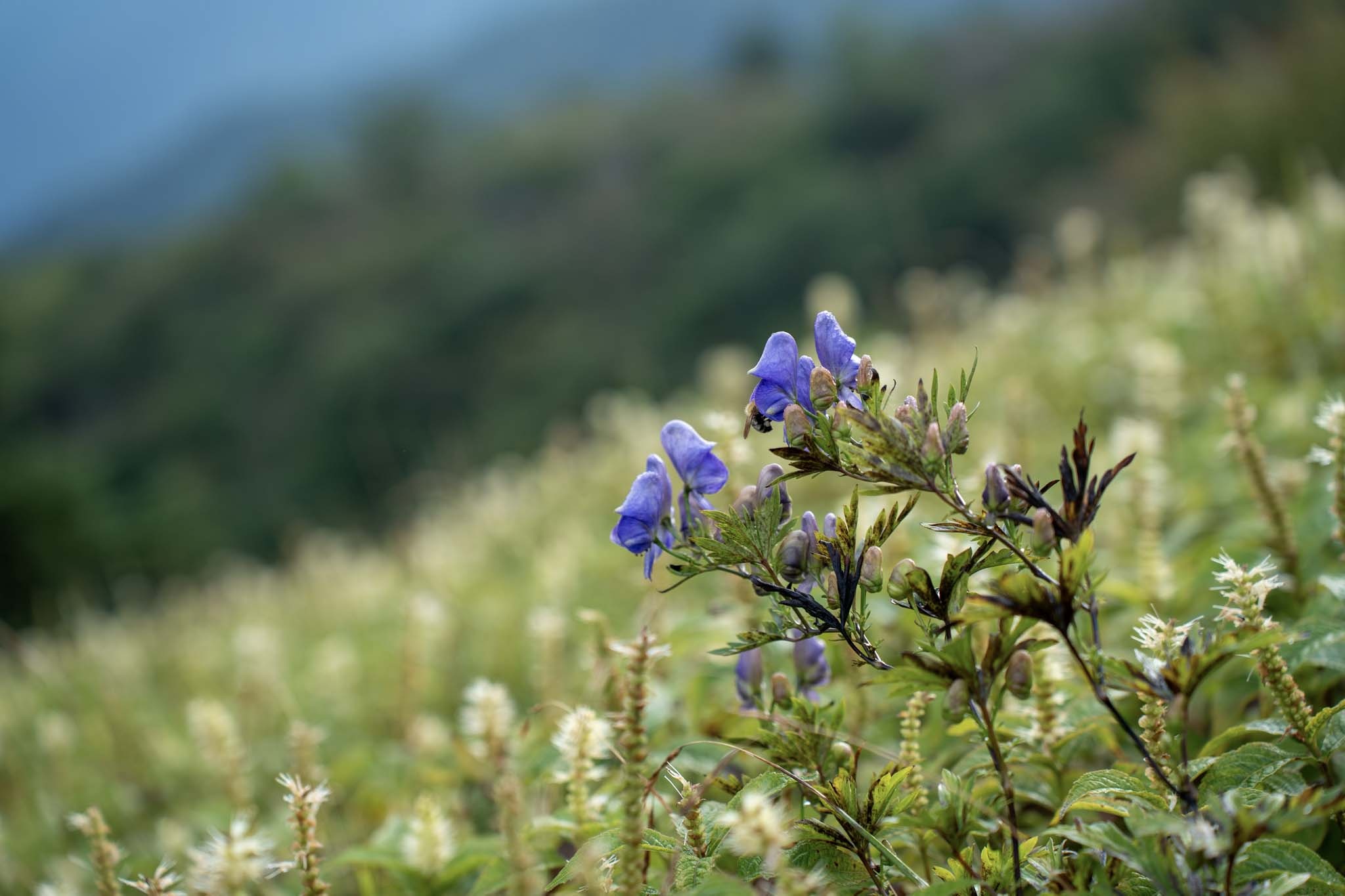 ここからいくつかの道に分かれるがリフト降り場の裏手の道から入った。左手にはテンニンソウの群生やシコクブシ(トリカブト)を前景に剣山地の山々が美しいグラデーションを見せていた。